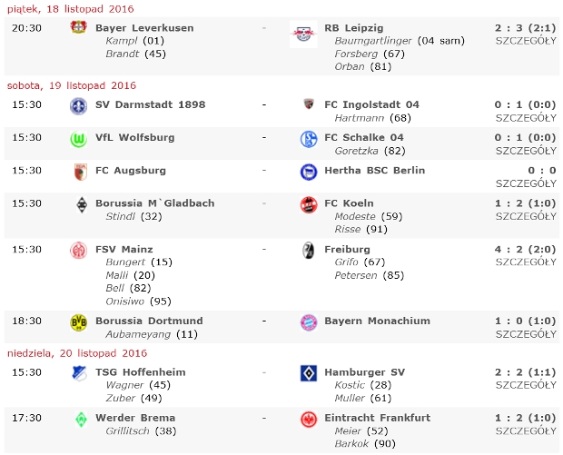 11. seria spotkań przyniosła nam również zmianę lidera tabeli, którym został beniaminek z Lipska. Rewelacja obecnego sezonu pokonała w piątek Bayer Leverkusen (3:2) i odniosła tym samym ósme zwycięstwo w obecnym sezonie ligowym. RB Lipsk spisuje się od początku kampanii znakomicie i z 27. punktami na koncie przewodzi stawce. Zespół Ralpha Hasenhuttla jest aktualnie jednym z dwóch w całej lidze, który nie zaznał jeszcze smaku porażki. Podobnym osiągnięciem może się pochwalić także TSG Hoffenheim, który podczas weekendu zremisował z najsłabszym w Bundeslidze Hamburgerem SV (2:2).