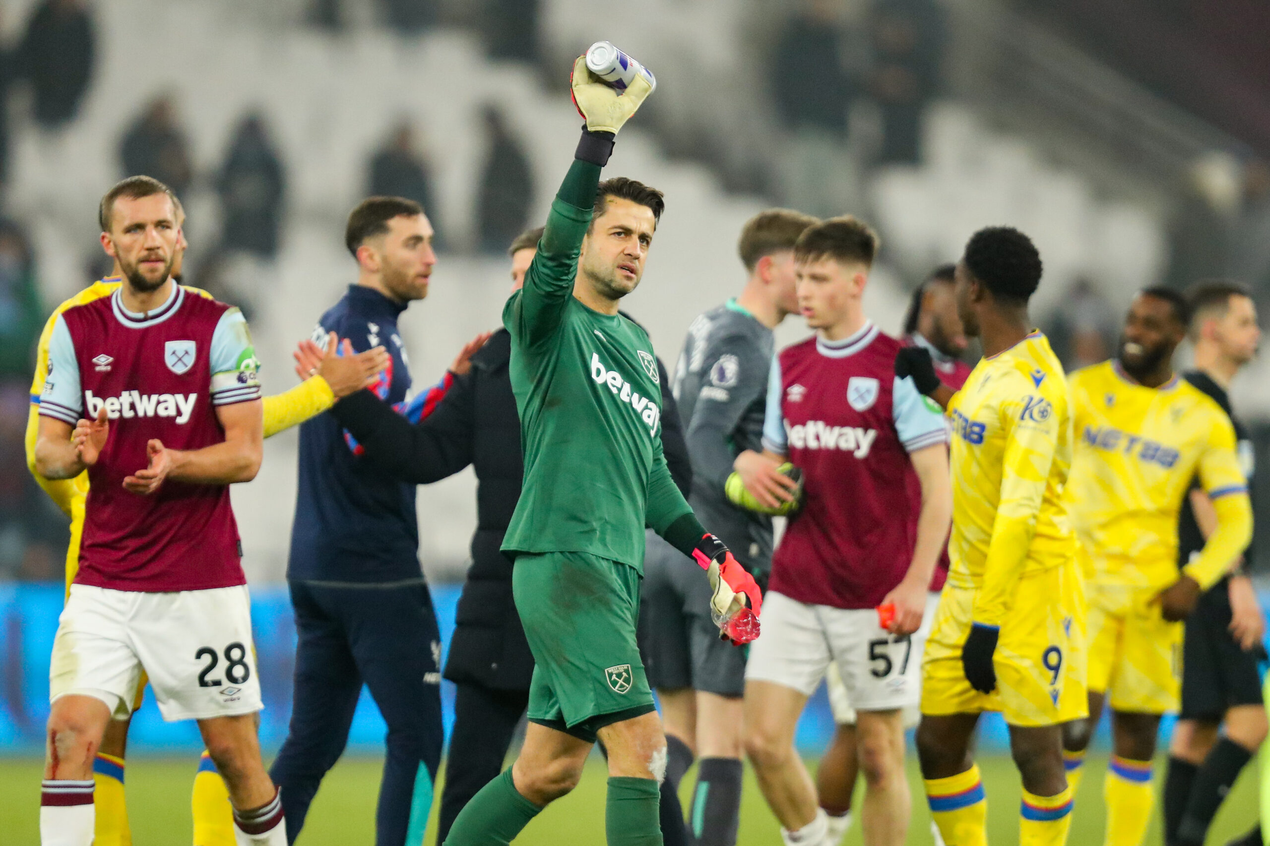 Lukasz Fabianski of West Ham United acknowledges the fans after the teams defeat following the Premier League match West Ham United vs Crystal Palace at London Stadium, London, United Kingdom, 18th January 2025