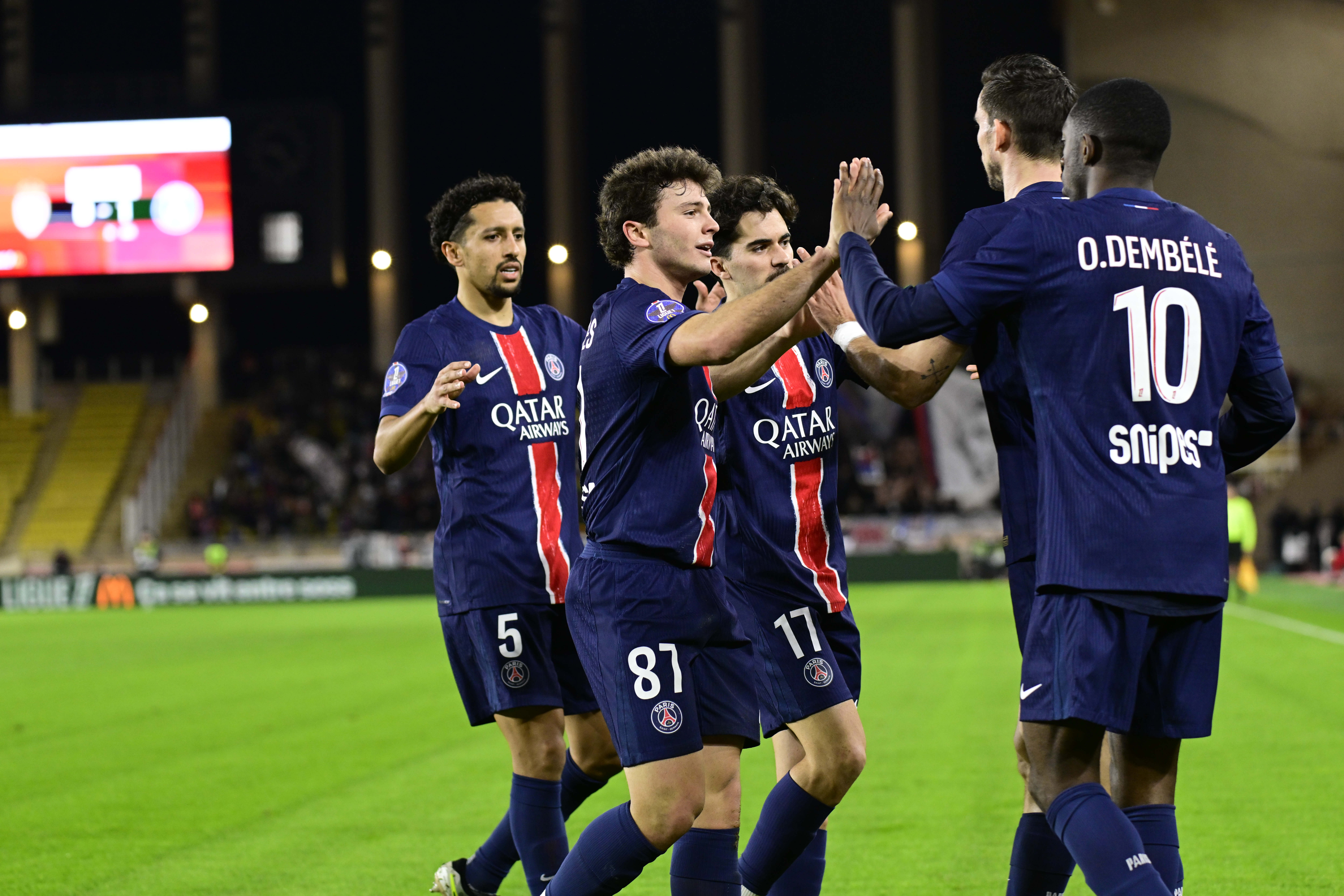 December 18, 2024, Monaco, Paris, France: L'AS Monaco reçoit le Paris Saint Germain sur la pelouse du Stade Louis II en match avancé de la 16e journée de Ligue 1 Mcdonald's..Joie PSG but Désiré DouÃ,Image: 948218317, License: Rights-managed, Restrictions: * Belgium France Germany Rights Out *, Model Release: no, Credit line: William Cannarella / Zuma Press / Forum