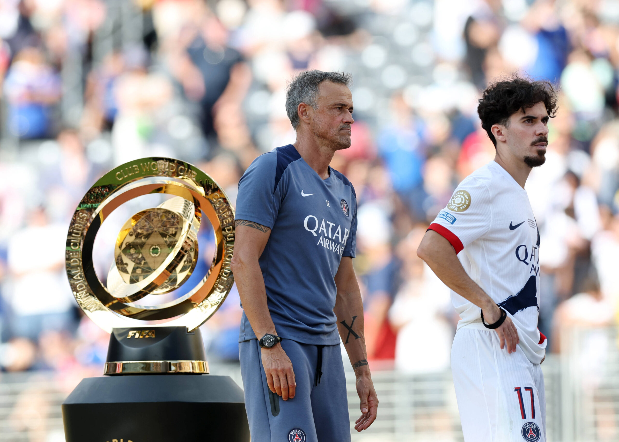 New Jersey, USA, 13th July 2025. Luis Enrique Head Coach of PSG walks past the trophy during the Chelsea vs Paris Saint Germain FIFA Club World Cup Final match at Metlife Stadium, New Jersey. Picture credit should read: David Klein / Sportimage EDITORIAL USE ONLY. No use with unauthorised audio, video, data, fixture lists, club/league logos or live services. Online in-match use limited to 120 images, no video emulation. No use in betting, games or single club/league/player publications. SPI_300_DK_Chelsea_PSG SPI-4015-0300