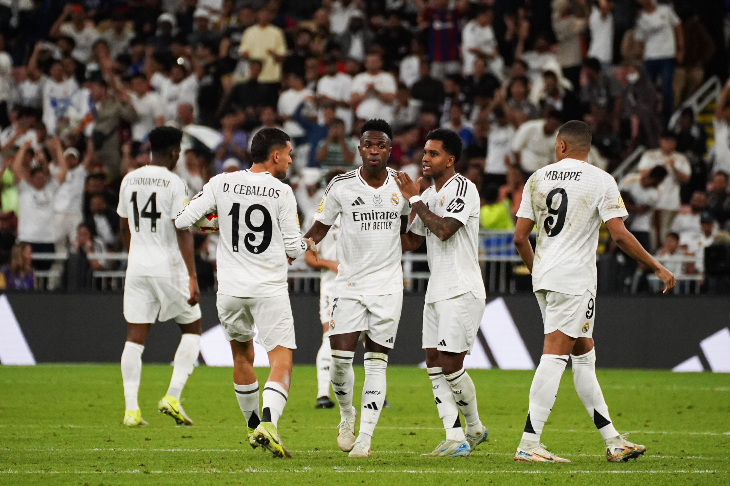 Real Madrid's Brazilian player Rodrygo goes (2-R) celebrates scoring his team's second goal with his teammate Brazilian player Vinicius Junior (C) during the Spanish Super Cup final match El Clasico between FC Barcelona and Real Madrid at King Abdullah Sports City. Final Score : Real Madrid 2 : 5 FC Barcelona (Photo by Ismael Adnan / SOPA Images/Sipa USA)