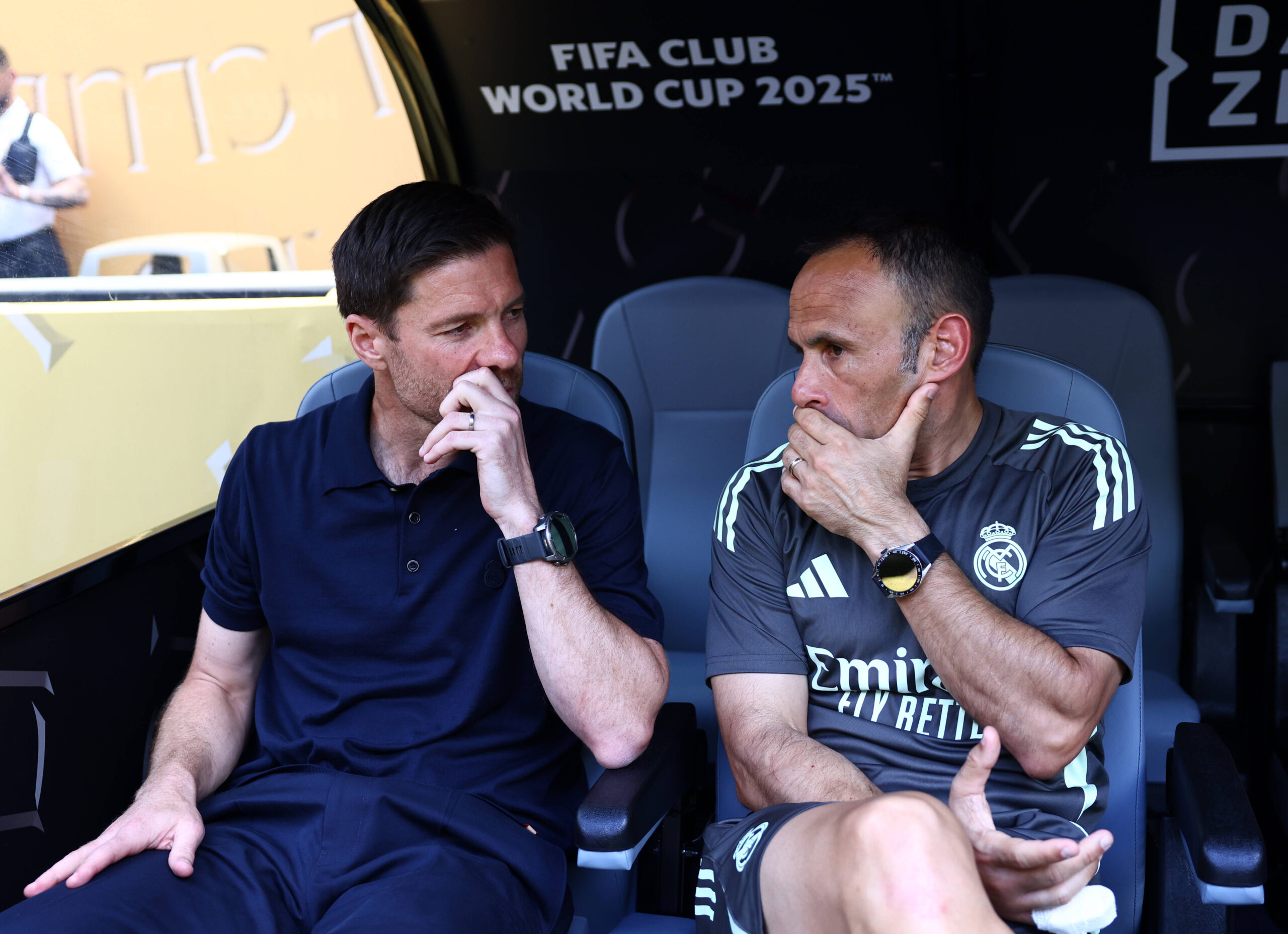 Miami Gardens, USA, 18th June 2025. Xabi Alonso manager of Real Madrid with assistant Sebastian Parrilla during the Real Madrid vs Al Hilal FIFA Club World Cup match at Hard Rock Stadium, Miami Gardens. Picture credit should read: David Klein / Sportimage EDITORIAL USE ONLY. No use with unauthorised audio, video, data, fixture lists, club/league logos or live services. Online in-match use limited to 120 images, no video emulation. No use in betting, games or single club/league/player publications. SPI_186_DK_Madrid_Al_Hilal SPI-3986-0183