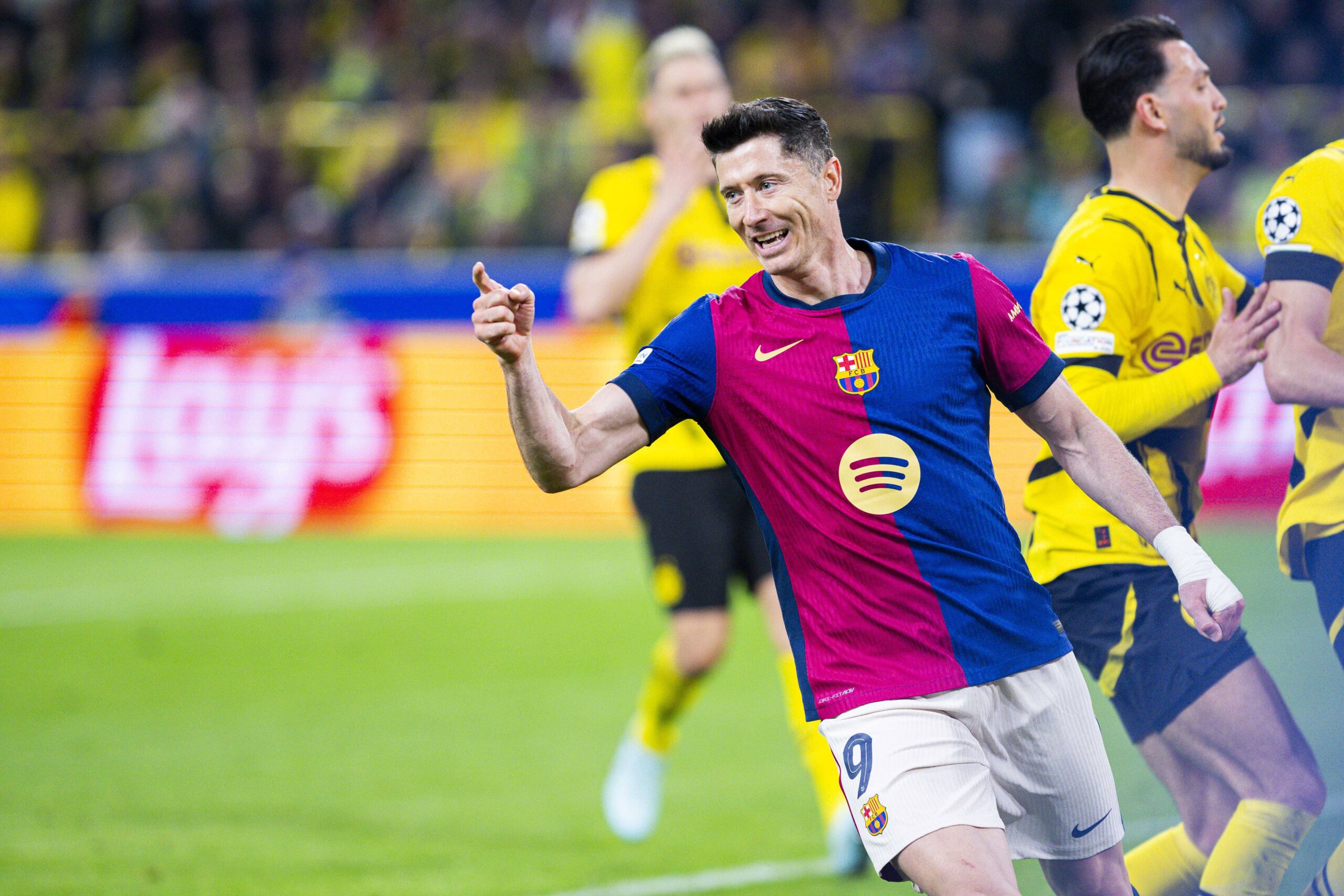 15.04.2025 - Fussball, 2024/2025, UEFA Champions League, Viertelfinale, Borussia Dortmund - FC Barcelona, Barca Robert Lewandowski Barcelona jubelt nach dem Tor zum 2:1 Dortmund Nordrhein-Westfalen Deutschland Signal Iduna Park *** 15 04 2025 Football, 2024 2025, UEFA Champions League, quarter-finals, Borussia Dortmund FC Barcelona Robert Lewandowski Barcelona cheers after scoring to make it 2 1 Dortmund North Rhine-Westphalia Germany Signal Iduna Park