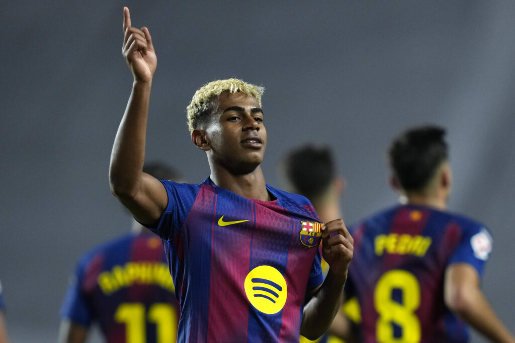Robert Lewandowski of FC Barcelona celebrates a goal 2-1 with Lamine Yamal during the Spanish championship LaLiga football match between FC Barcelona and Real Sociedad on 28 September 2025 at Estadi Olimpic Lluis Companys in Barcelona, Spain (Photo by /Sipa USA)