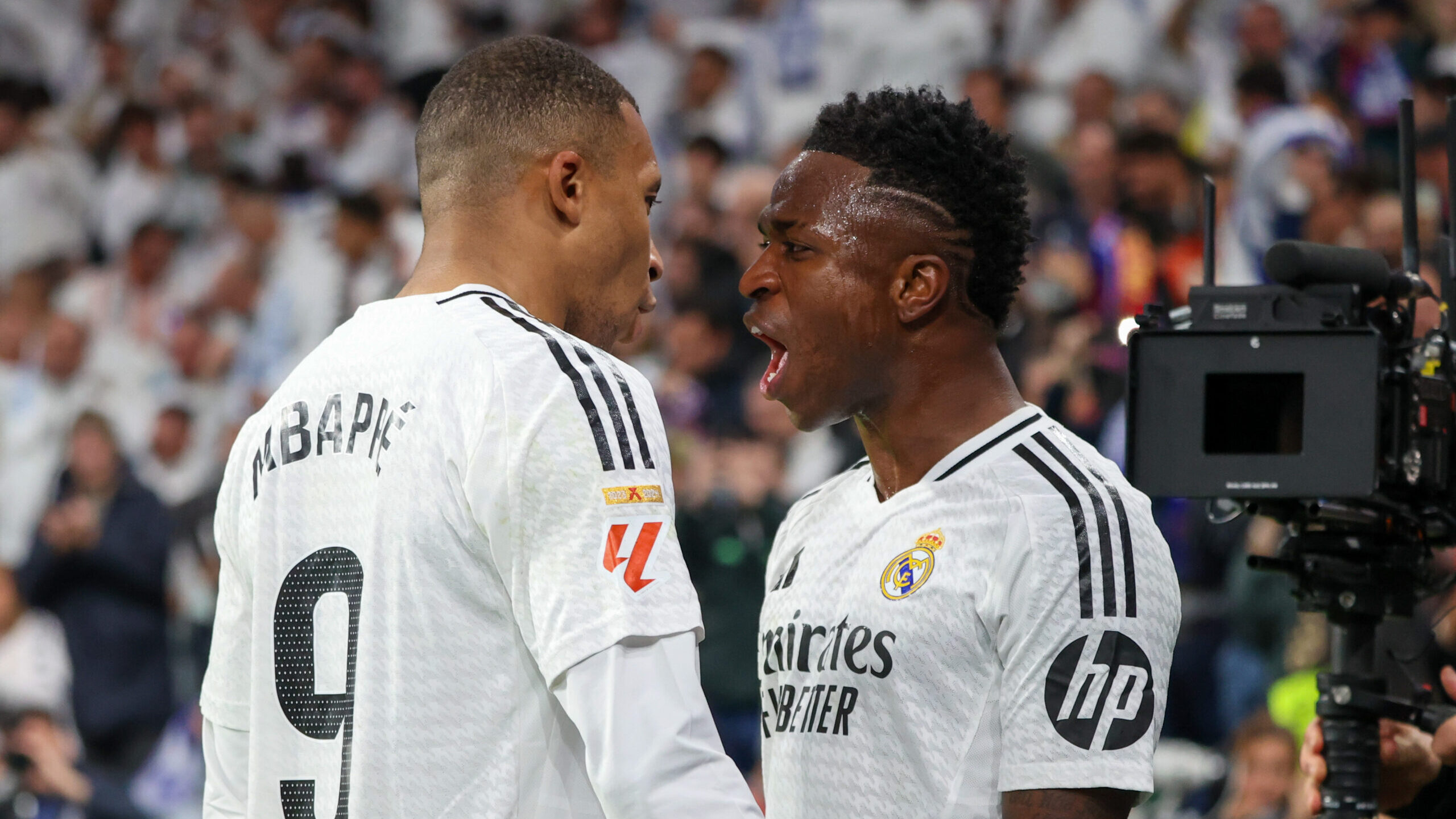 Kylian Mbappe (L) and Vinicius Jr (R) celebrate a goal, later disallowed, during the Liga match between Real Madrid and FC Barcelona at the Santiago Bernabeu Stadium. Real Madrid had a score of 0 goals a 4 against FC Barcelona at the Estadio Santiago Bernabeu in a new year in the LA Spanish Football League. (Photo by David Canales / SOPA Images/Sipa USA)