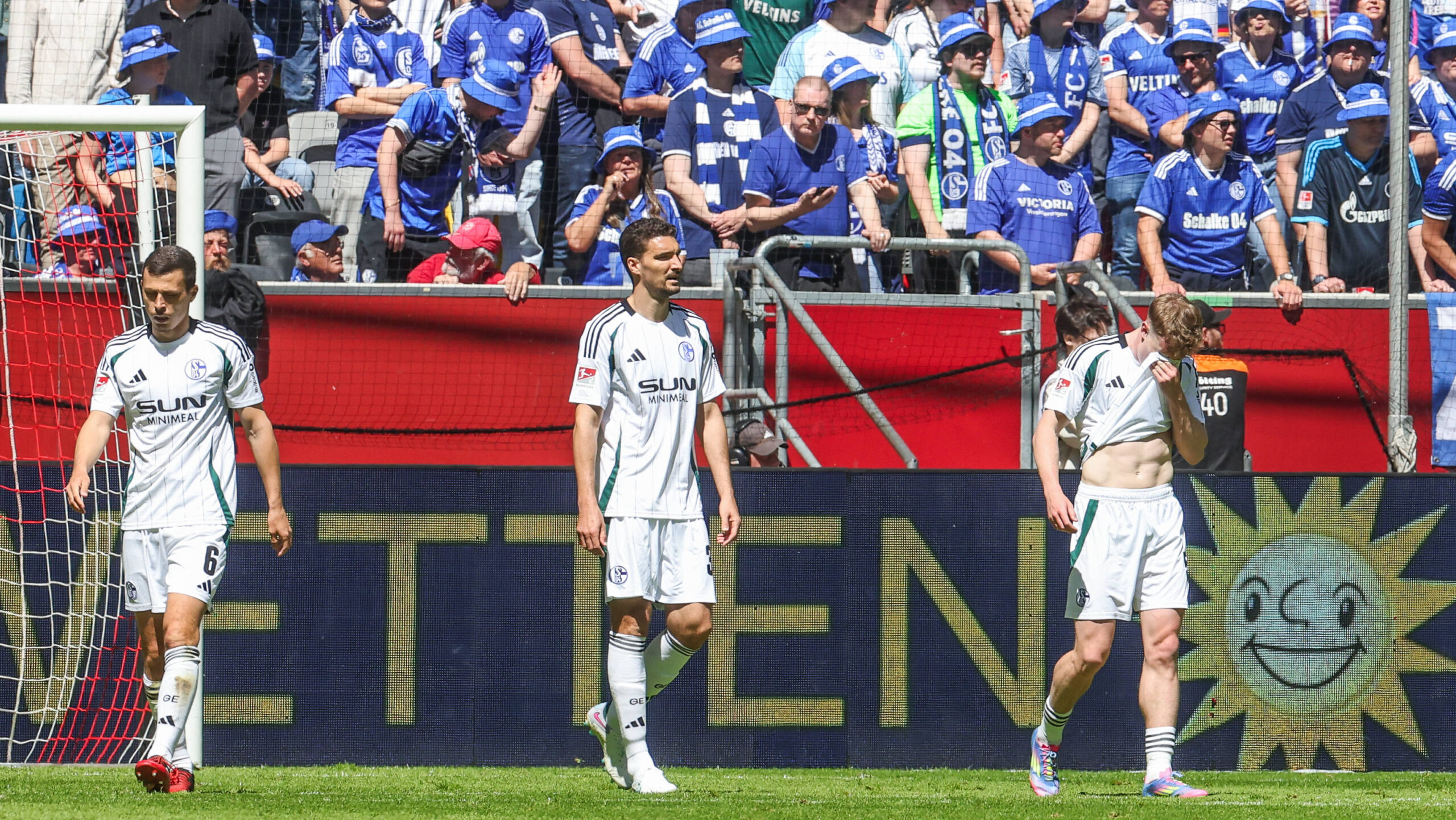 10.05.2025, Fussball, Saison 2024/2025, 2. Bundesliga, 33. Spieltag, Fortuna Dusseldorf - FC Schalke 04, v. l. Ron Schallenberg FC Schalke 04, Marcin Kaminski FC Schalke 04, Derry John Murkin FC Schalke 04 Dusseldorf Merkur Spiel-Arena NRW Deutschland xRHR-FOTO/TRx *** 10 05 2025, Football, Season 2024 2025, 2 Bundesliga, Matchday 33, Fortuna Dusseldorf FC Schalke 04, f l Ron Schallenberg FC Schalke 04 , Marcin Kaminski FC Schalke 04 , Derry John Murkin FC Schalke 04 Dusseldorf Merkur Spiel Arena NRW Germany xRHR PHOTO TRx Copyright: TimxRehbein/RHR-FOTOx RHR-FOTO/TR
