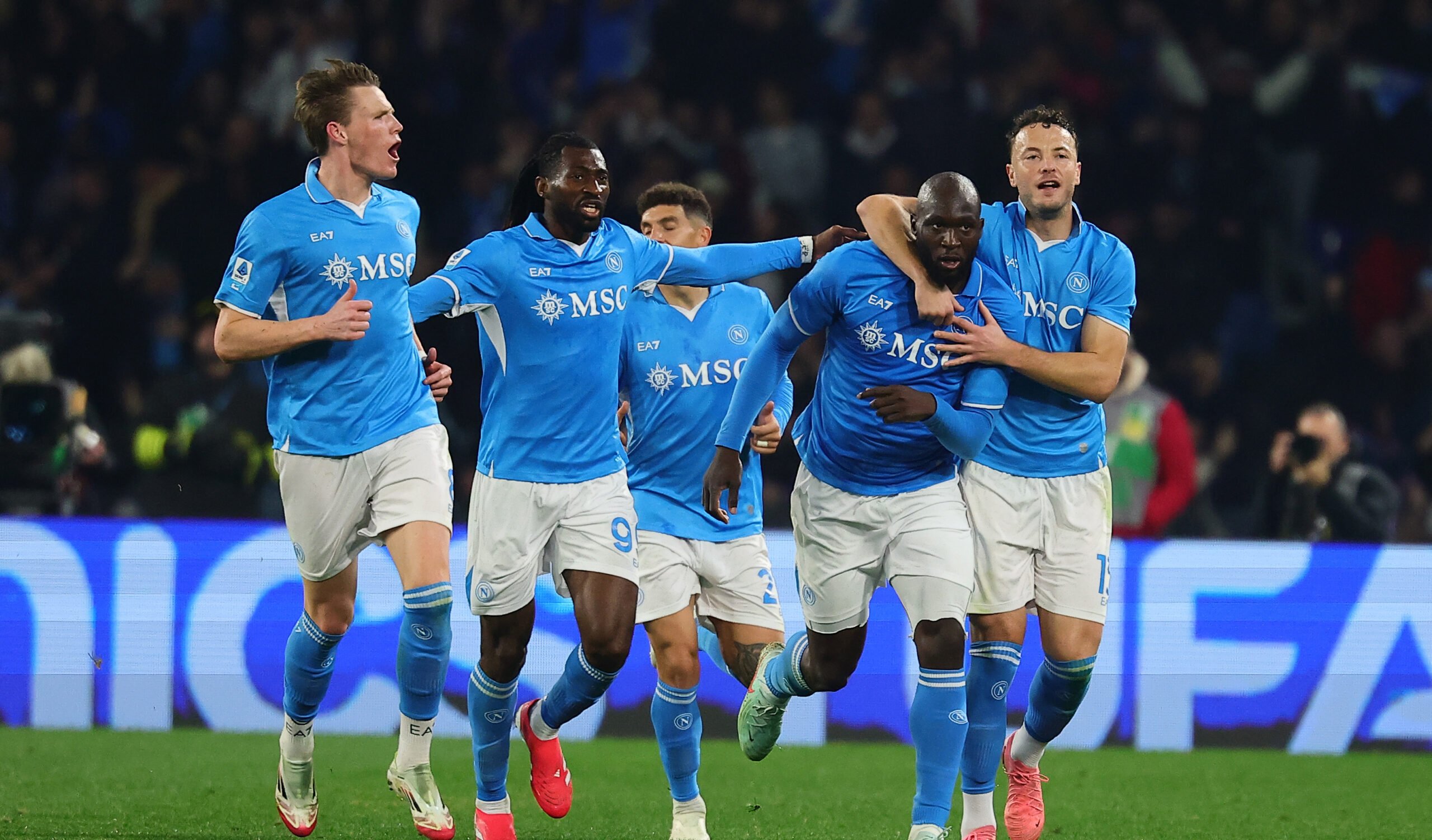 Romelu Lukaku of SSC Napoli celebrates with team mates  after scoring the goal of 2-1 during the Serie A football match between SSC Napoli and Juventus FC at Diego Armando Maradona stadium in Naples (Italy), January 25th, 2025./Sipa USA *** No Sales in France and Italy ***