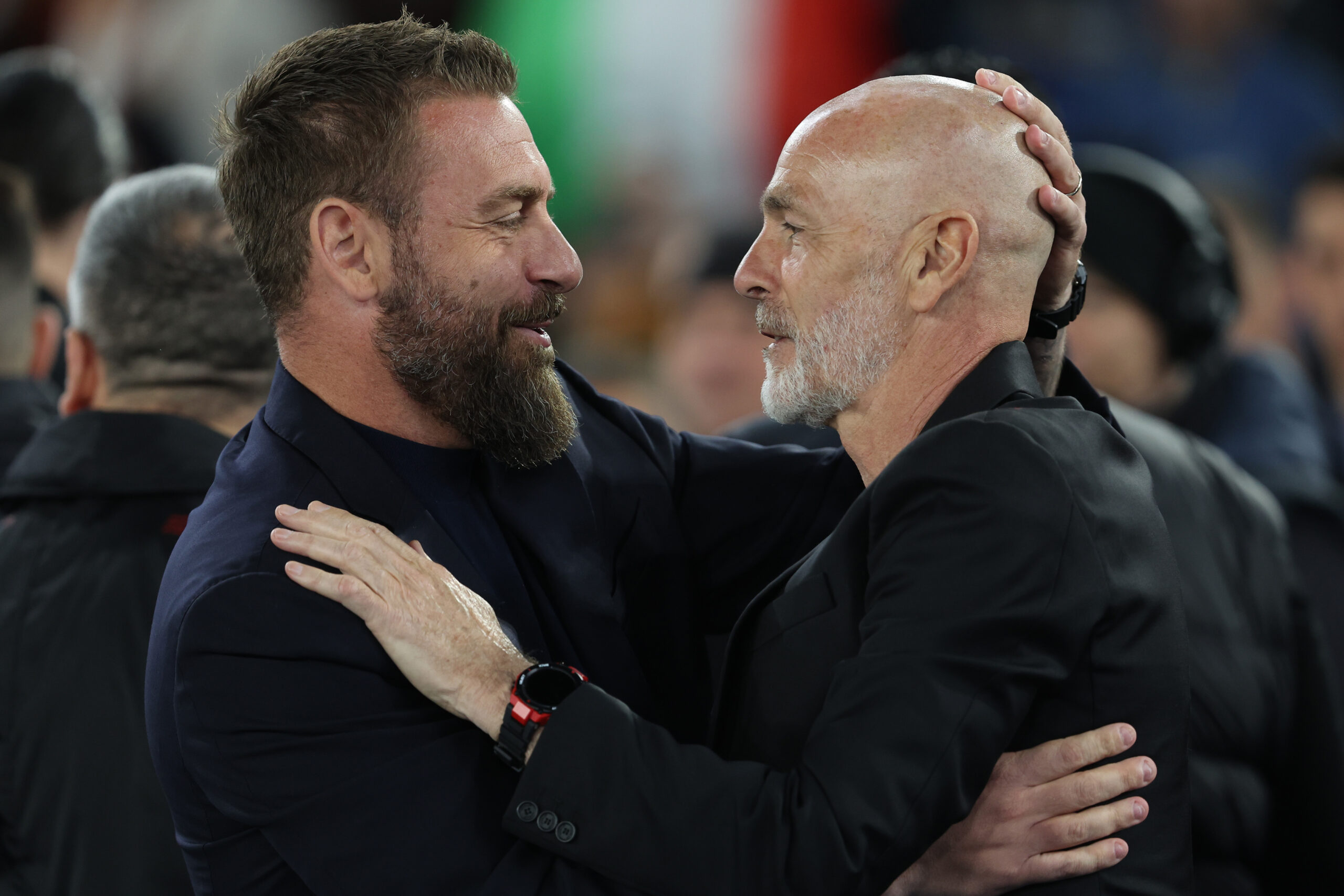 Rome, Italy 18.04.2024: Stefano Pioli coach Milan greet Daniele De Rossi coach of Roma before the UEFA Europa League 2023-2024, quarter final , football match between AS Roma vs AC Milan at Olympic Stadium in Rome. (Photo by Marco Iacobucci/IPA Sport / ipa-/IPA/Sipa USA)