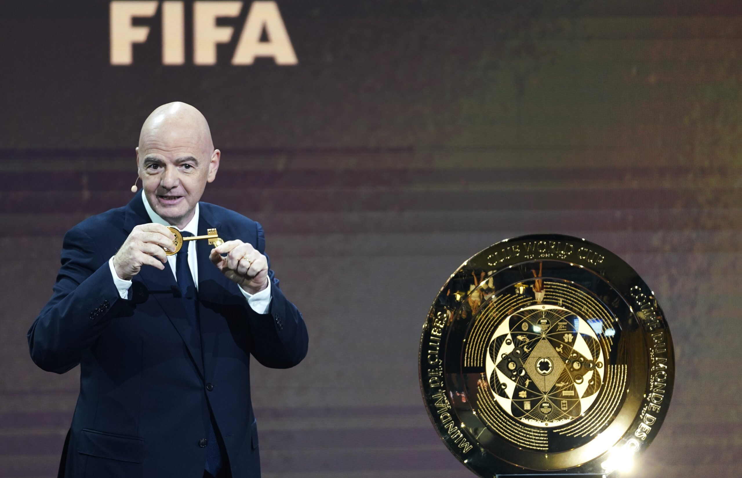 (241206) -- MIAMI, Dec. 6, 2024 (Xinhua) -- FIFA President Gianni Infantino reacts during the draw ceremony for the FIFA Club World Cup 2025 in Miami, the United States, on Dec. 5, 2024. (Xinhua/Wu Xiaoling)