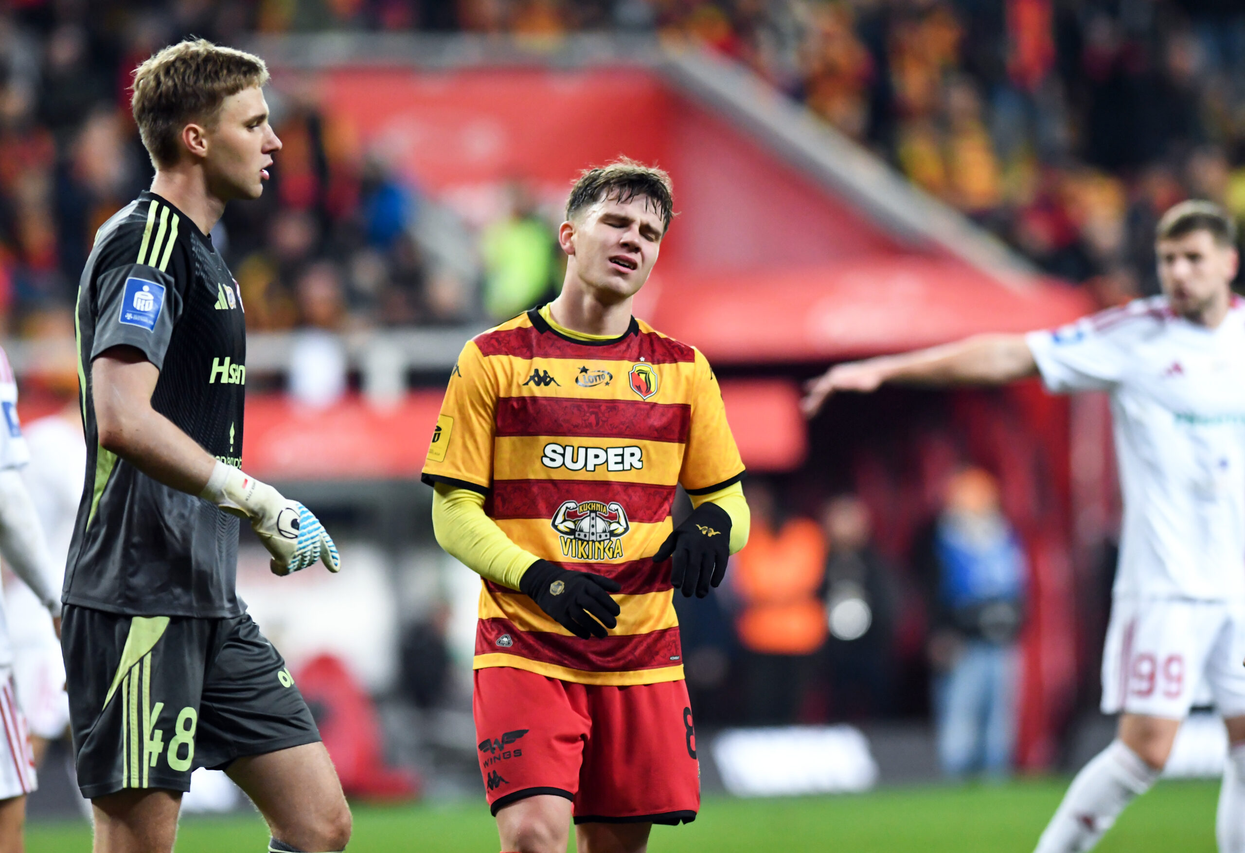 2025.11.02 Bialystok Pilka nozna PKO Ekstraklasa sezon 2025/2026 14. kolejka rozgrywek Jagiellonia Bialystok (zolto-czerwone) - Rakow Czestochowa N/z (L-P) Oliwier Zych bramkarz Rakowa Czestochowa Oskar Pietuszewski Foto Michal Kosc / PressFocus