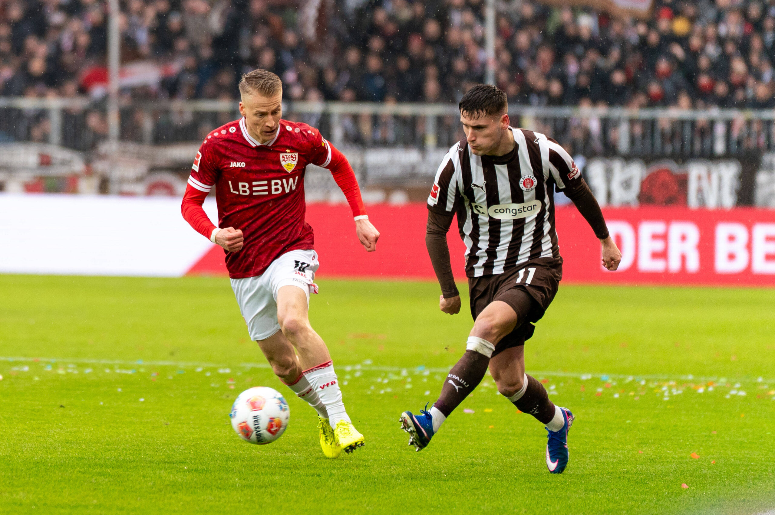 Dziesięć minut po rozpoczęciu drugiej połowy „Piraci” podwyższyli prowadzenie. Na listę strzelców wpisał się Danel Sinani, który wykorzystał rzut karny. W 90. minucie bramkę kontaktową zdobył Jamie Leweling i to jedyne, na co stać było tego dnia gości. VfB wróciło z Hamburga na tarczy. W barwach St. Pauli wystąpił również Adam Dźwigała.