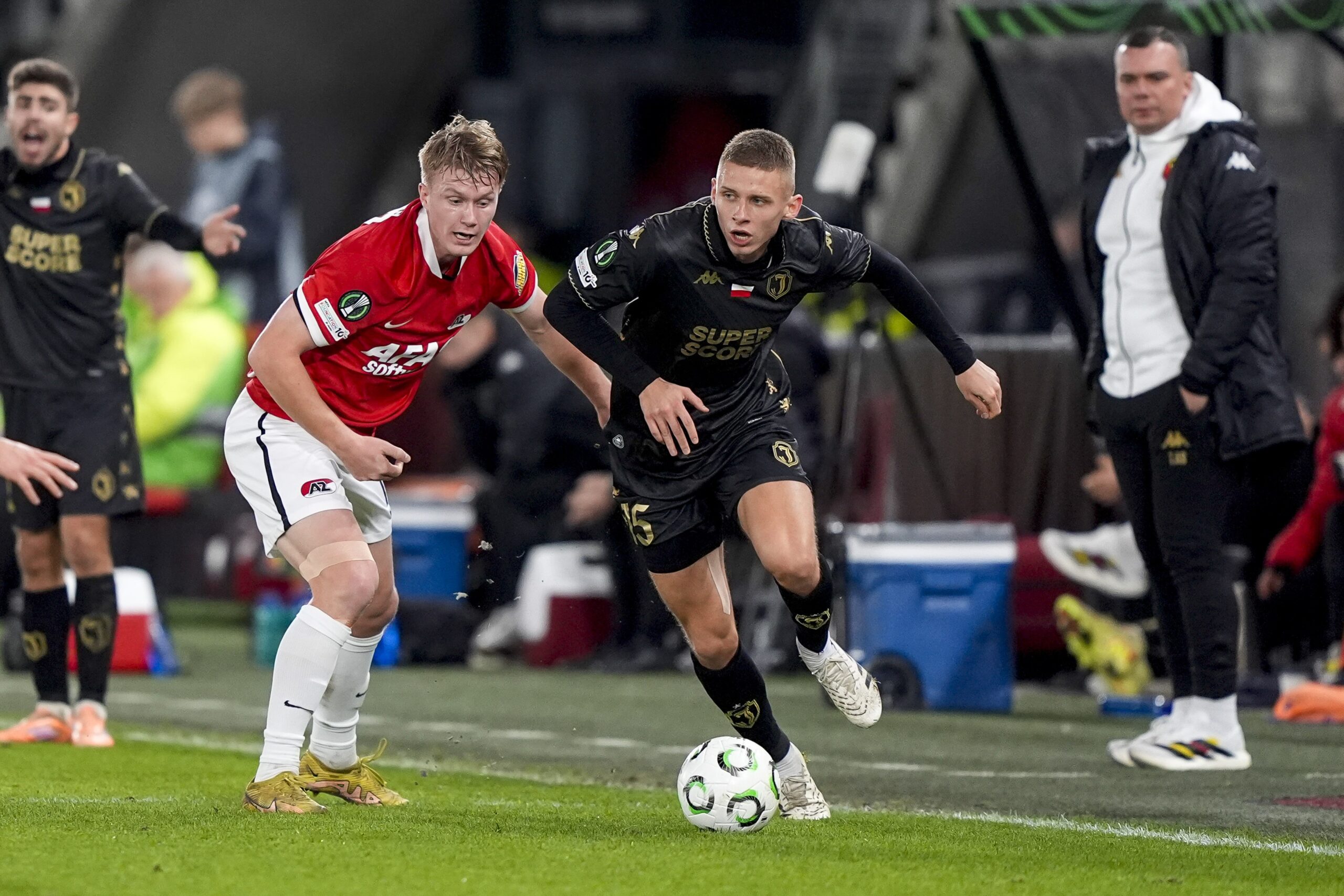 ALKMAAR , 18-12-2025 , AFAS stadium , season 2025 / 2026 ,  UEFA Europa Conference League football , match between AZ and Jagiellonia Bia?ystok , Picture shows Jagiellonia Bialystok player Norbert Wojtuszek and AZ player Isak Jensen (Photo by Pro Shots/Sipa USA)