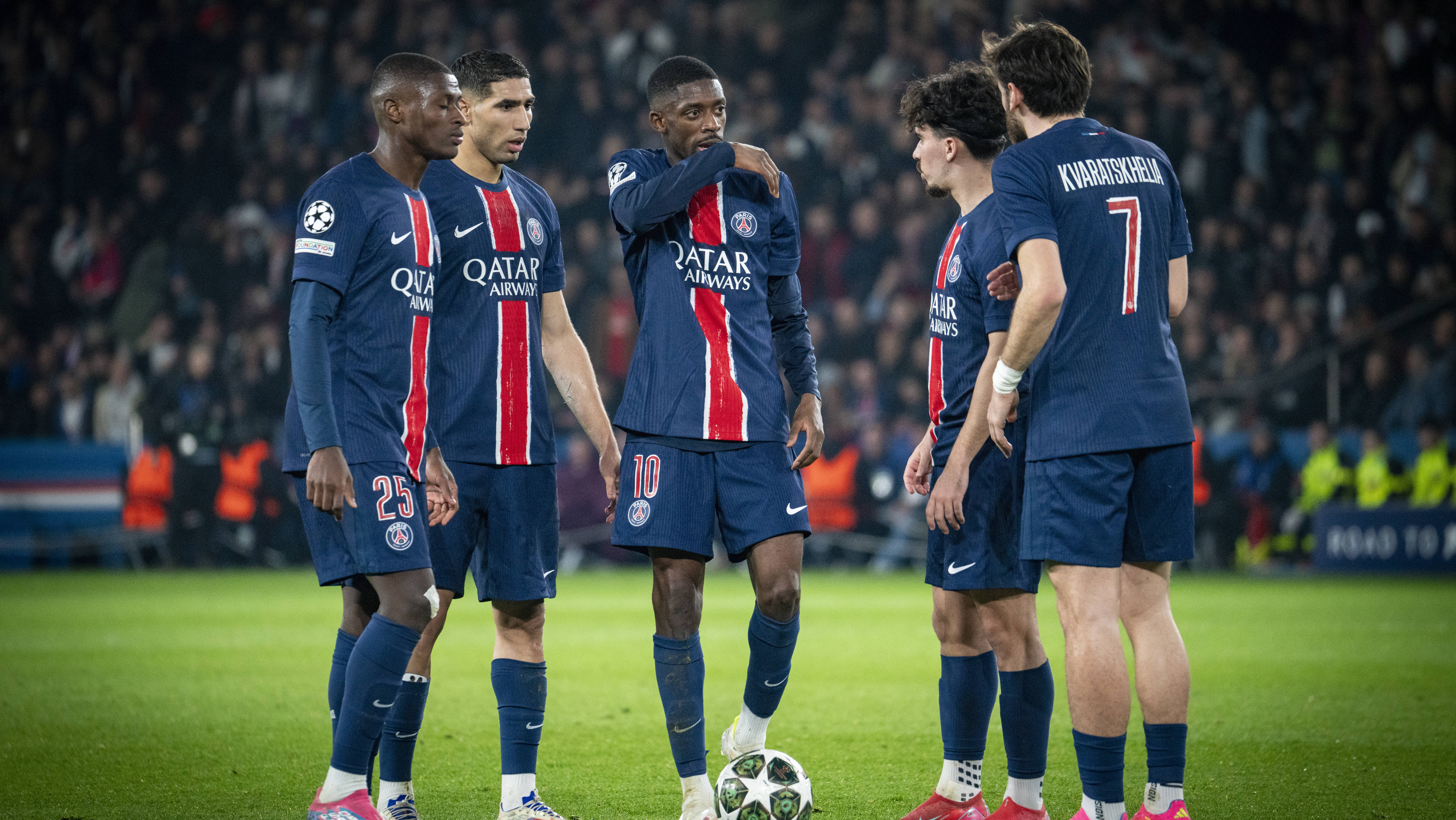 PARIS, FRANCE - MARCH 05: (Left to Right) Nuno Mendes, Achraf Hakimi, Ousmane Dembele, Vithinia and Kvara of PSG during the UEFA Champions League 2024/25 UEFA Champions League 2024/25 Round of 16 first leg match between Paris Saint-Germain and Liverpool FC at Parc des Princes on March 05, 2025 in Paris, France.//CEZARDGABRIELLE_psgliv_82/Credit:Gabrielle CEZARD/SIPA/2503060248