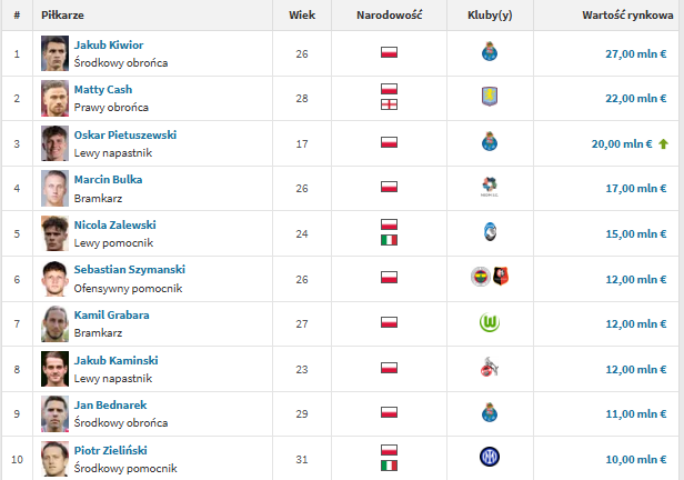 Obecnie najwyższą wartość wśród Polaków ma Jakub Kiwior, którego Transfermarkt wycenia na 27 milionów euro. Na drugim miejscu znajduje się Matty Cash z wyceną na poziomie 22 milionów euro, a wspomniany wcześniej Pietuszewski zamyka czołową trójkę. W dalszej kolejności plasują się między innymi Marcin Bułka, Nicola Zalewski oraz Sebastian Szymański.