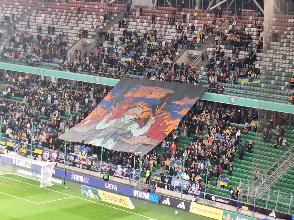 Spotkanie z zespołem Arnara Gunnlaugssona wśród ukraińskiej diaspory zamieszkałej w Polsce budziło duże zainteresowanie. Choć stadion przy ul. Łazienkowskiej 3 nie wypełnił się w 100%, to nie miało to wpływu na atmosferę. Publika żywo reagowało na kolejne akcje ukraińskich piłkarzy, bo ci prezentowali się tak, jak życzył sobie tego Rebrow – aktywnie i agresywnie. Mecz rozpoczął się jednak organizacyjnego zgrzytu. W trakcie grania hymnów ukraińscy fani zaprezentowali sektorówkę z ukraińskim żołnierzem, za którym w tle znajdował się płonący Kreml. Wypada zadać pytanie, jak to się ma do sytuacji z piątku, kiedy polskim kibicom w starciu z Holandią, uniemożliwiono zaprezentowanie swojej sektorówki.