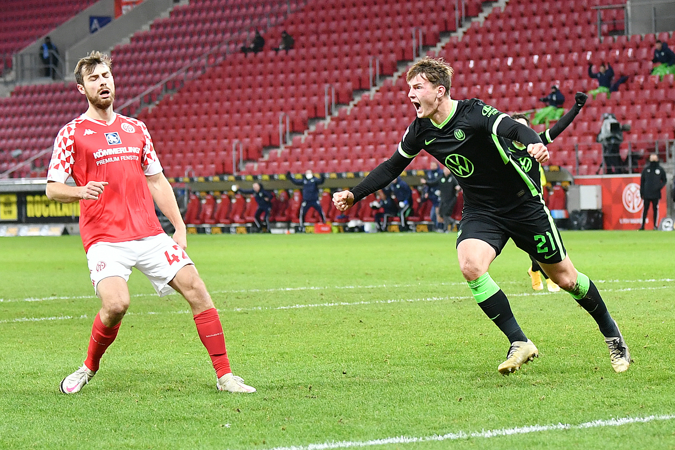 (210120) -- MAINZ, Jan. 20, 2021 (Xinhua) -- Bartosz Bialek (R) of Wolfsburg celebrates scoring during a German Bundesliga football match between FSV Mainz 05 and Vfl Wolfsburg in Mainz, Germany, Jan. 19, 2021. (Photo by Ulrich Hufnagel/Xinhua)