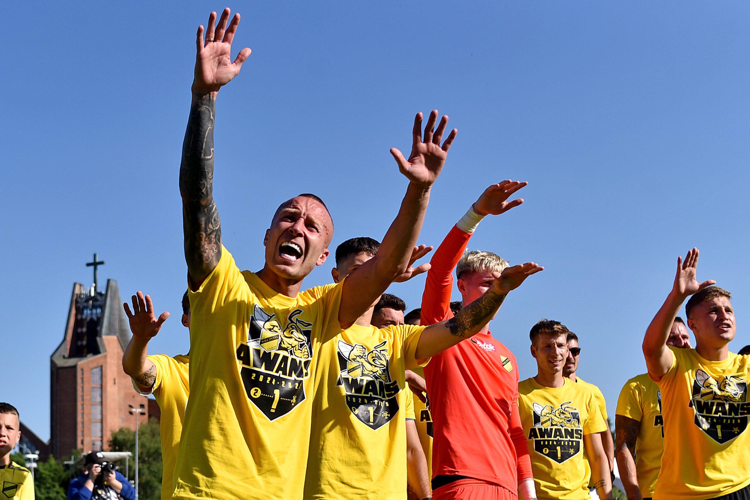 Pilkarze Wieczystej, radosc z awansu, euforia, po meczu, feta po awansie, Jacek Goralski