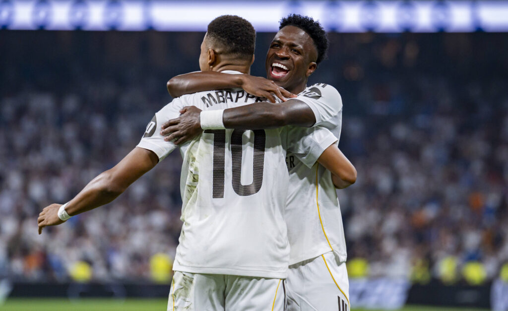 Real Madrid CF v RCD Mallorca - LaLiga EA Sports Kylian Mbappe of Real Madrid R celebrates his goal with Trent Alexander-Arnold L and Franco Mastantuono C during the LaLiga EA Sports football match between Real Madrid CF and RCD Mallorca at Estadio Santiago Bernabeu on August 30, 2025 in Madrid, Spain. Madrid Estadio Santiago Bernabeu Madrid Spain Copyright: xAlbertoxGardinx AGardin_20250830_Foot_Liga_Real_Madrid_Mallorca_0250