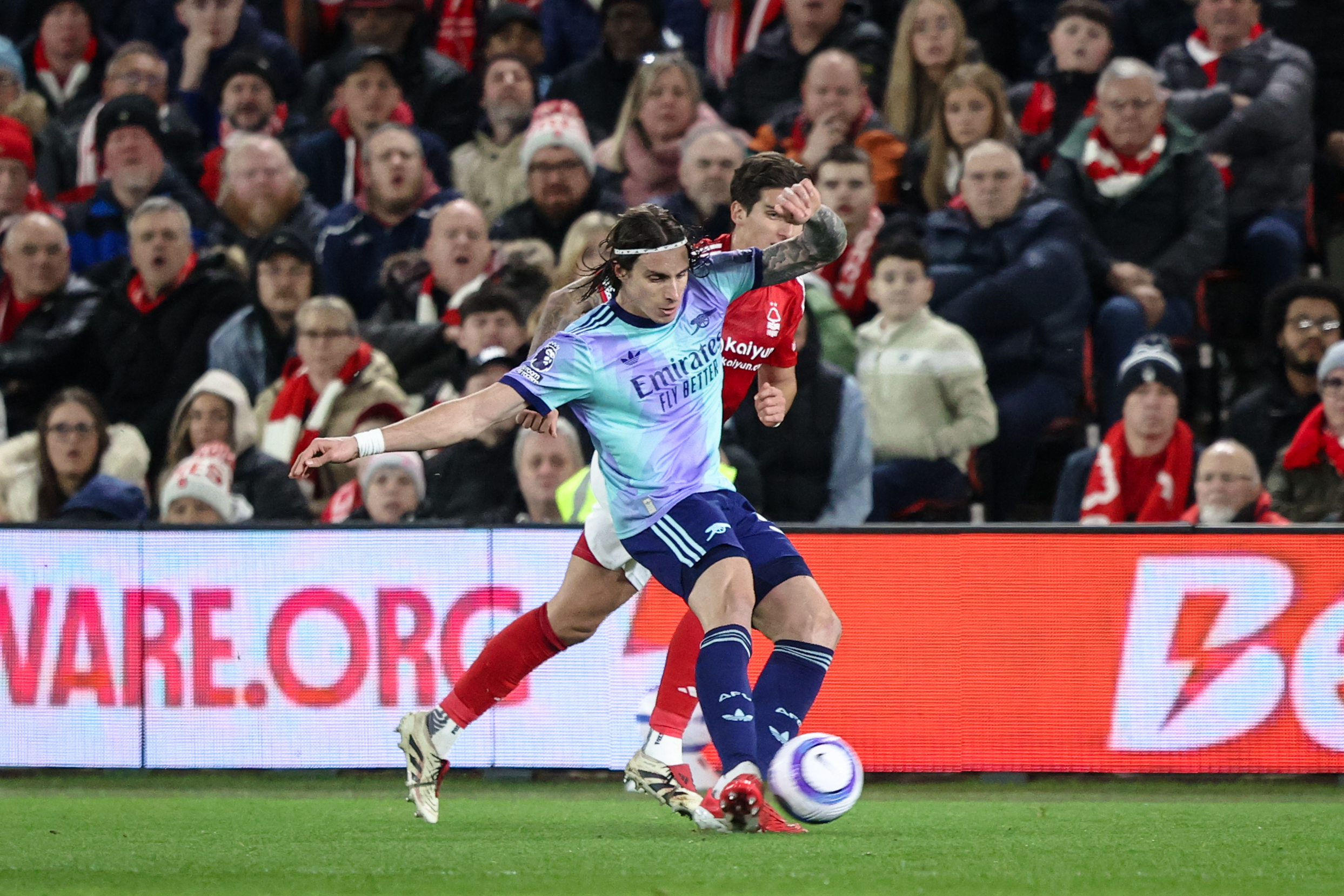 Pierwsza połowa na City Ground była wyjątkowo rozczarowująca. Dość powiedzieć, że jedyna godna odnotowania okazja miała miejsce w 23. minucie, kiedy to Riccardo Calafiori trafił w słupek. W tej części rywalizacji, gospodarze oddali jeden celny strzał, a goście z Londynu żadnego.