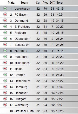 Po 32.kolejce Bundesligi (niepełnej, bo do rozegrania są jeszcze dwa niedzielne mecze tej serii spotkań), na prowadzeniu po uwzględnieniu wszystkich założeń znajduje się Bayer Leverkusen z 70 punktami na koncie. W sumie nie ma się co dziwić, bo zdecydowaną większość goli dla Aspiryn strzelają w tym sezonie Niemcy – niesamowity Stefan Kiessling oraz Andre Schuerrle. Łącznie dwaj panowie strzelili już w tym sezonie Bundesligi 34 bramki!