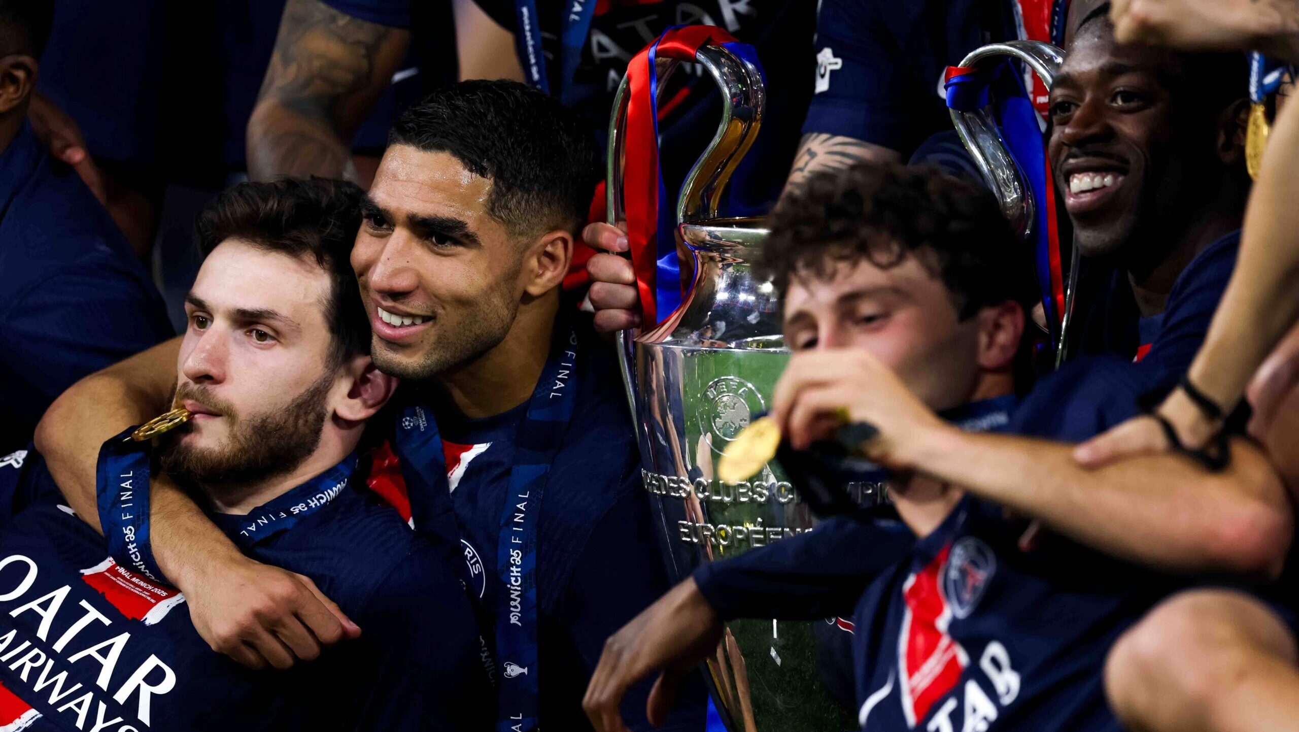 PSGs players Kvaratskhelia and Hakimi with the trophy during the ceremony  during  Final - Paris Saint-Germain FC vs Inter - Internazionale, UEFA Champions League football match in Munich, Germany, May 31 2025-/ ipa-agency.net - //IPAPRESSITALY_IPA_Agency_IPA58487215/Credit:/IPA/SIPA/2506011513